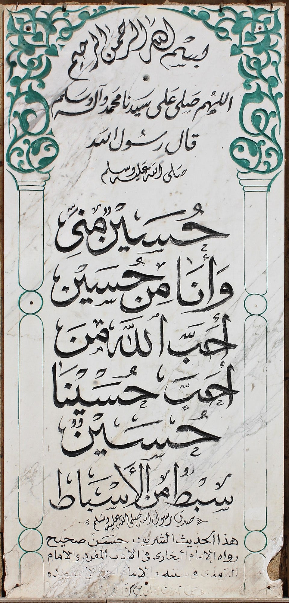 Imam Hussein Hadith inscription, Al-Hussein Mosque, Cairo. Bismillah Al-Rahman Al-Rahim (In the name of God the most merciful)